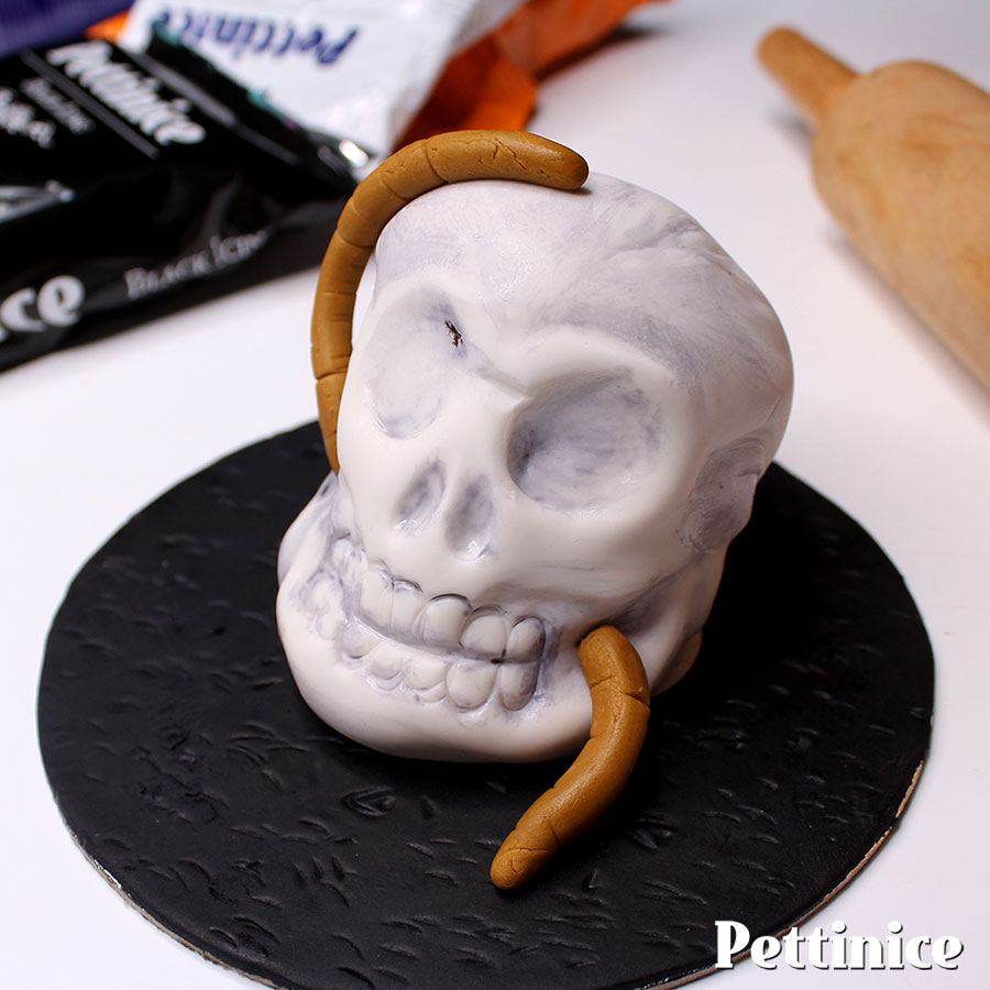 Colour mix fondant a bone colour by mixing small amount of black and white to make gray, and then mix new shade with orange as shown.