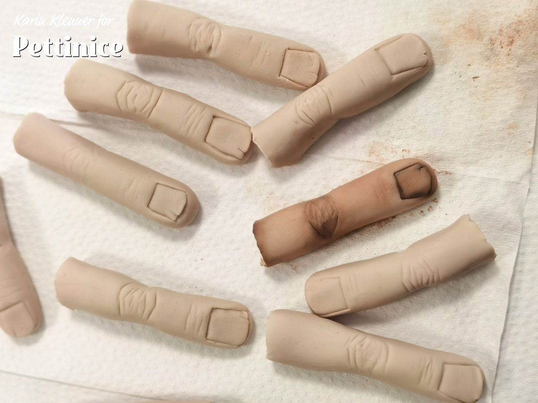 I started with pinks and peaches, adding them to the wrinkles and nail and to the side of the finger. Then I added a bit of brown to my peach and pink and dusted where I wanted more shadows. Then I went over with a stronger brown and black.