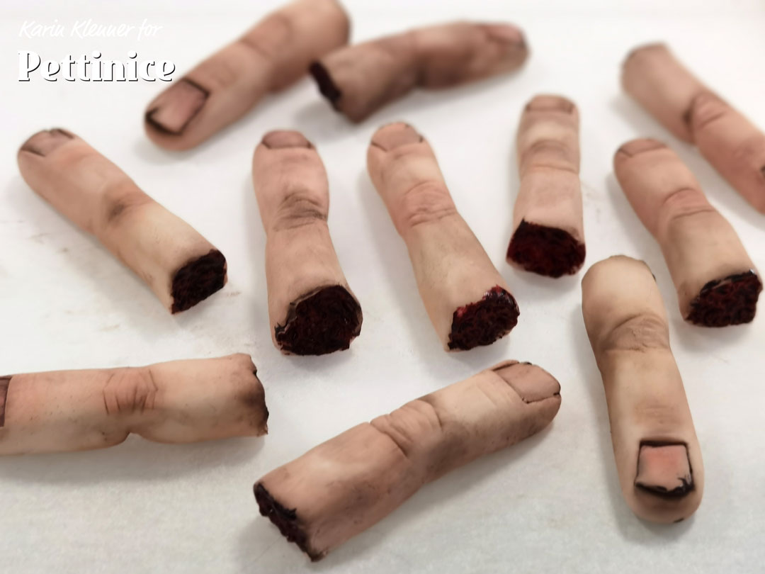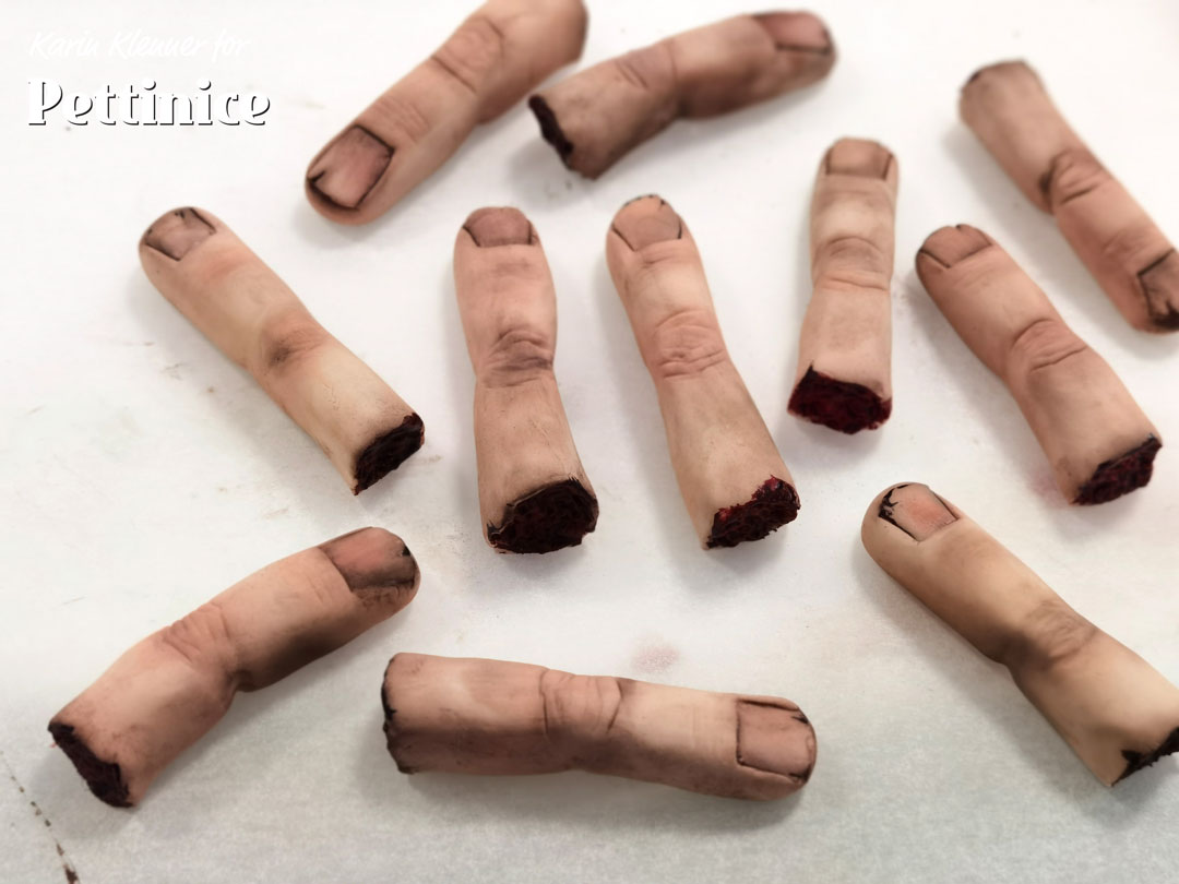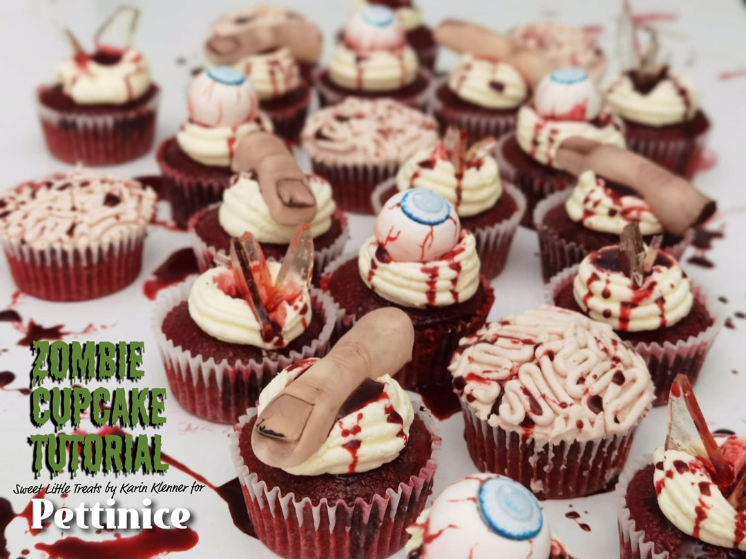 I placed my finger on top of a red velvet cupcake with scatters of fake edible blood to really make them creepy!