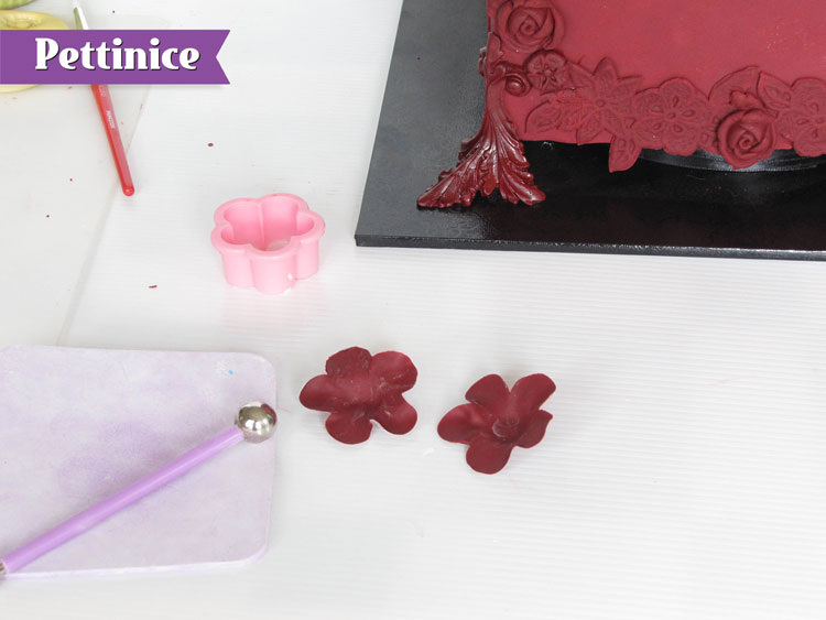 Press Pettinice into the rose mould and pop out, make five of these and attach to the cake as shown.