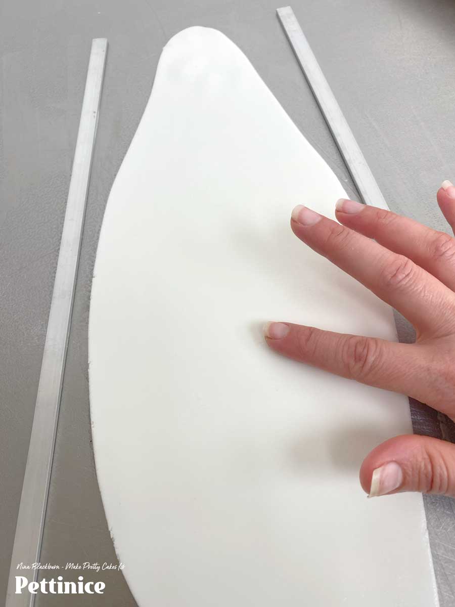 After rolling out your Pettinice, use a clean damp food safe cloth to wipe the top of your fondant with water.