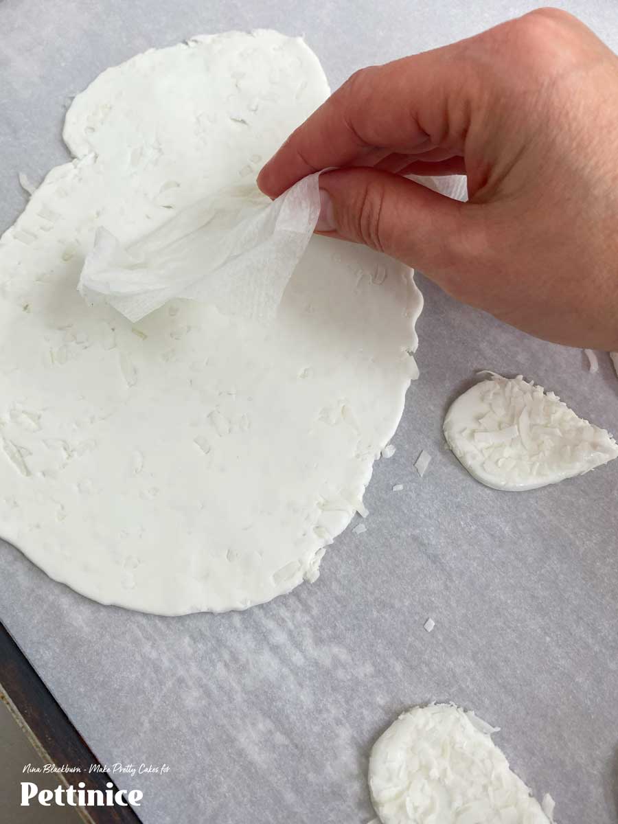 Pat down the coconut to insure it sticks, and begin cutting out your shapes. Press firmly and wiggle.