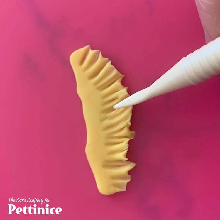Take your small scissors (I use curved nail scissors that have only ever been used for cake work), start at the tip and make little staggered V-shaped snips all over.