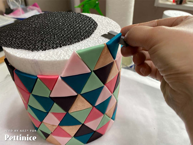When you get to that final row - pop on a few at a time and then get your razor blade or sharp knife and carefully cut the excess flat against the bottom of the cake card. Be careful to not distort the shape of the triangle, I did little frequent cuts, rather than dragging the blade along in one swoop.