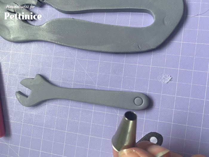 Roll out a piece of grey fondant big enough for the spanner about 1/3 – 1/2cm, decent thick ness) (we’ll do one tool at a time).