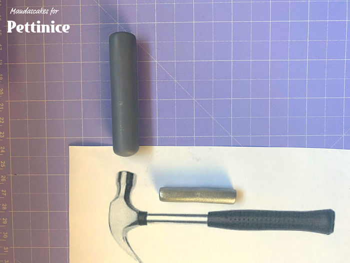 Make the handle of the hammer by simply rolling a fat sausage, flattening the end and trimming where it will attach to the stem. I’ve made indents on the handle for extra detail using the end of a Dresden tool.