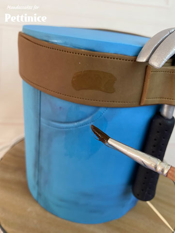 I’ve then made lines for side, front and back seams, a fly and pockets and made additional stitch lines for extra detail using the quilting tool. I literally use my own jeans as a basic guide. Don’t get too hung up on detail here, a lot will be covered by the belt and tools. I’ve then dusted areas to give depth with blue and black dusting powder mixed together. These are a tradies/DIYers jeans, they’re rough, so let it be rough . I’ve placed the cake on a pre iced wood look board, but this is again, optional.
