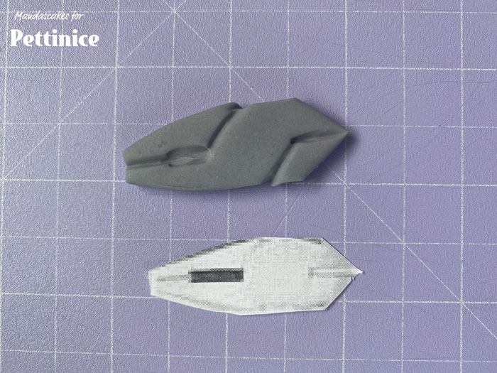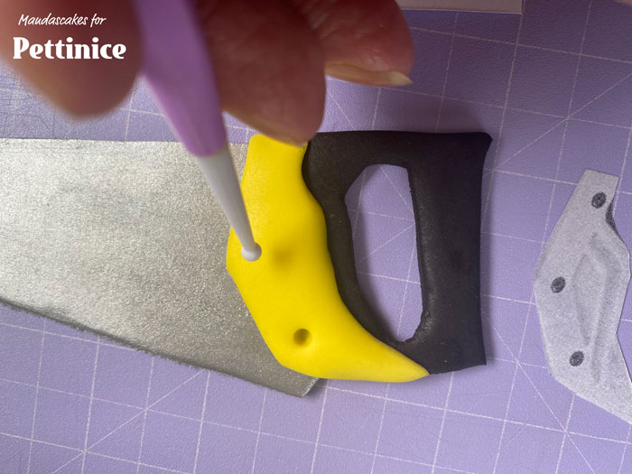Cut out the handle of the saw template, roll a piece of black fondant and use the template to cut out a handle. I’ve also cut an extra piece of yellow detailing from the template.