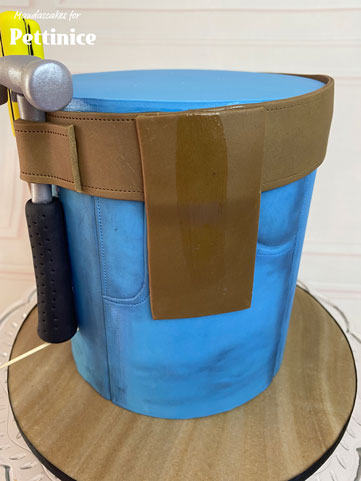 Using edible glue, adhere this to the top edge of the cake. Mines a bit wonky, but I’ve done this on purpose, after all, who’s tool belt sits straight?