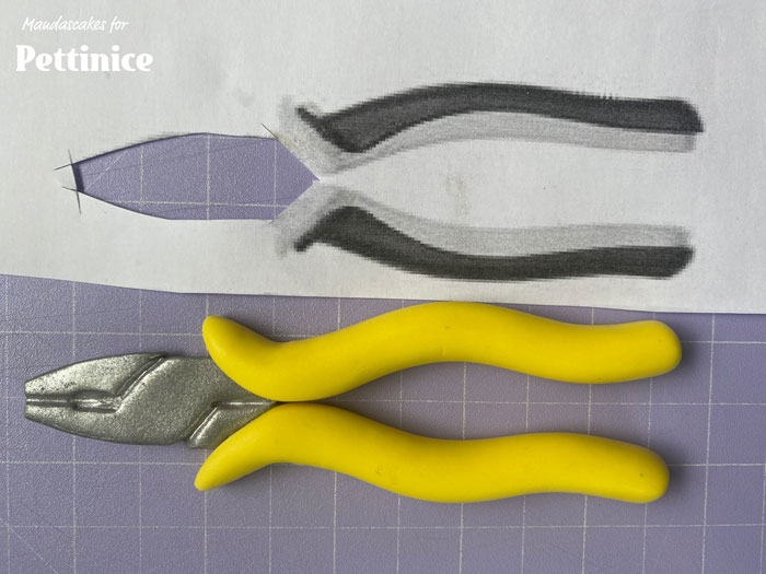 Cut out some tabs and pockets as shown which will ‘hold’ the tools. It’s totally up to you which ones go in pockets and which ones go in tabs. I’ve laid them out how I want them to go on the cake.