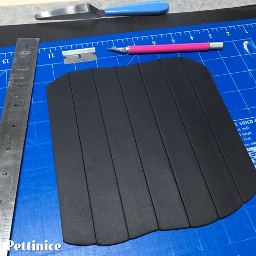 2. Flip your cake upside down. Roll Pettinice fondant into a long panels and using your ruler, create the 1" strips. If your cake is slightly fatter, be sure to adjust your measurements accordingly.