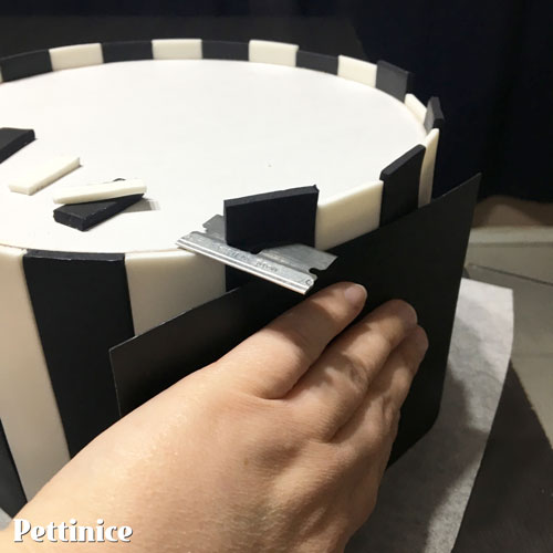 3. After sticking all your strips, trim off the excess fondant cleanly with a razor. flip your cake back around and use a fondant smoother for a clean finish.